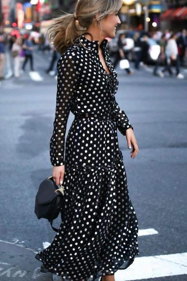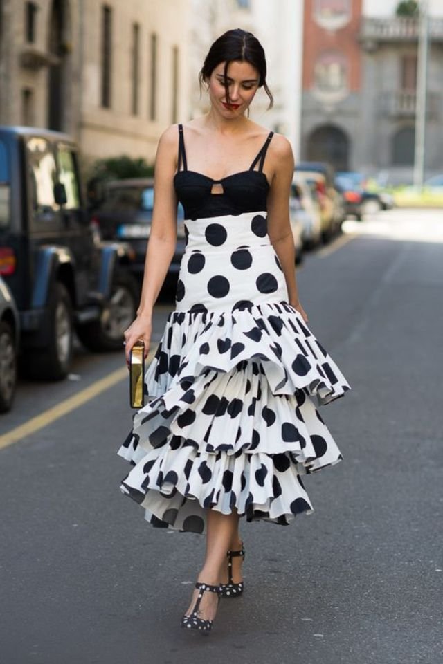 Черно-белые платья в горох — еще один тренд этого лета. Лучше всего они смотрятся с соломенными шляпами и симпатичными сумочками. В качестве обуви подойдут классические лодочки или босоножки.