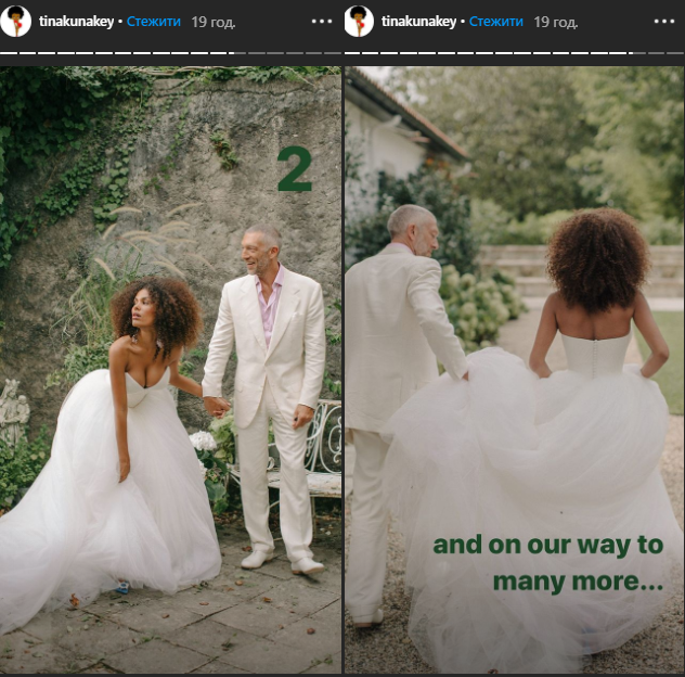 23-летняя модель Тина Кунаки опубликовала в Сети редкие кадры со свадьбы со своим 53-летним возлюбленным, бывшим мужем Моники Беллуччи, актером Венсаном Касселем.