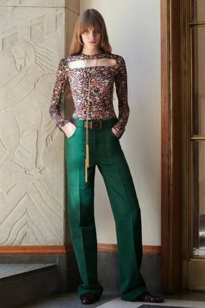 Данная коллекция богата классическими брюками со стрелками с большими карманами. Все наряды выполнены в ярких и сочных оттенках с летними принтами.