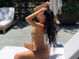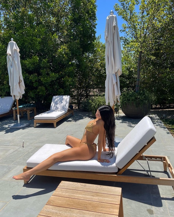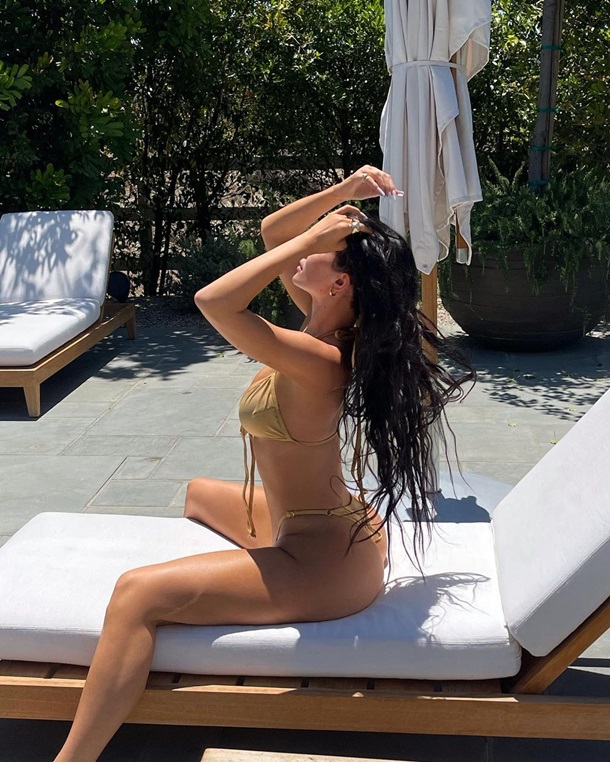 Для откровенной фотосессии Кайли выбрала золотое микробикини от бренда GOOD AMERICAN, соосновательницей которого является ее сестра Хлои Кардашьян.
