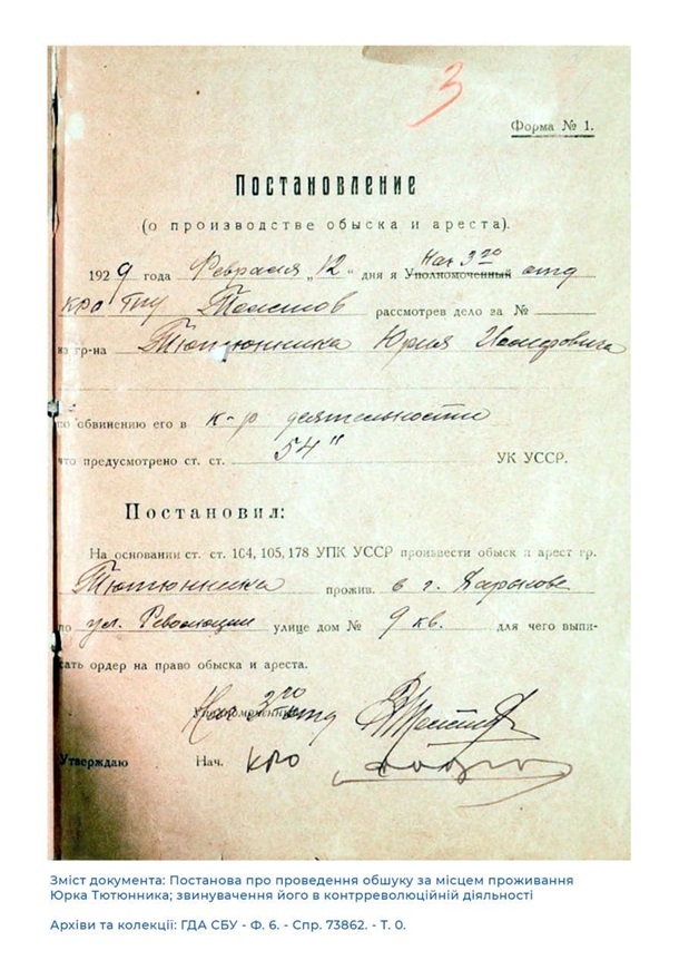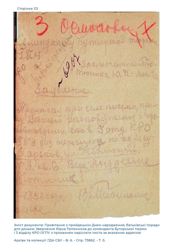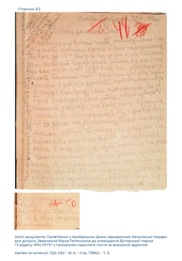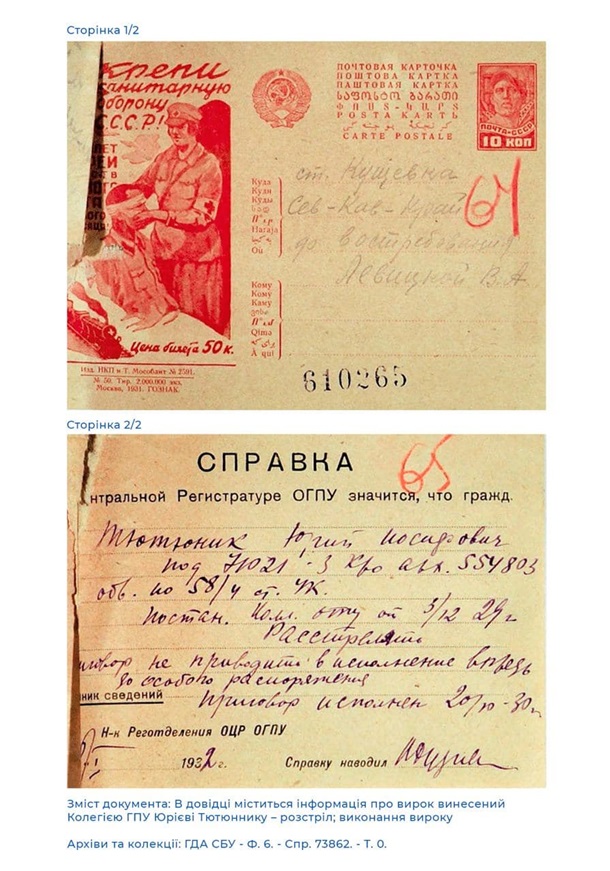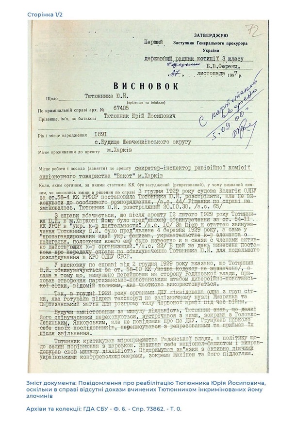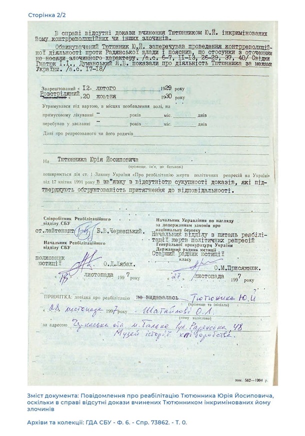 "После непродолжительного проживания в эмиграции генерала обманом вернули в Украину. Шантажируя семьей, его заставили раскаяться. Во второй раз его арестовали 12 февраля 1929 года и отправили в московскую "Бутырку". Юрия Тютюнника расстреляли 20 октября 1930 года", - добавили в СБУ.