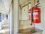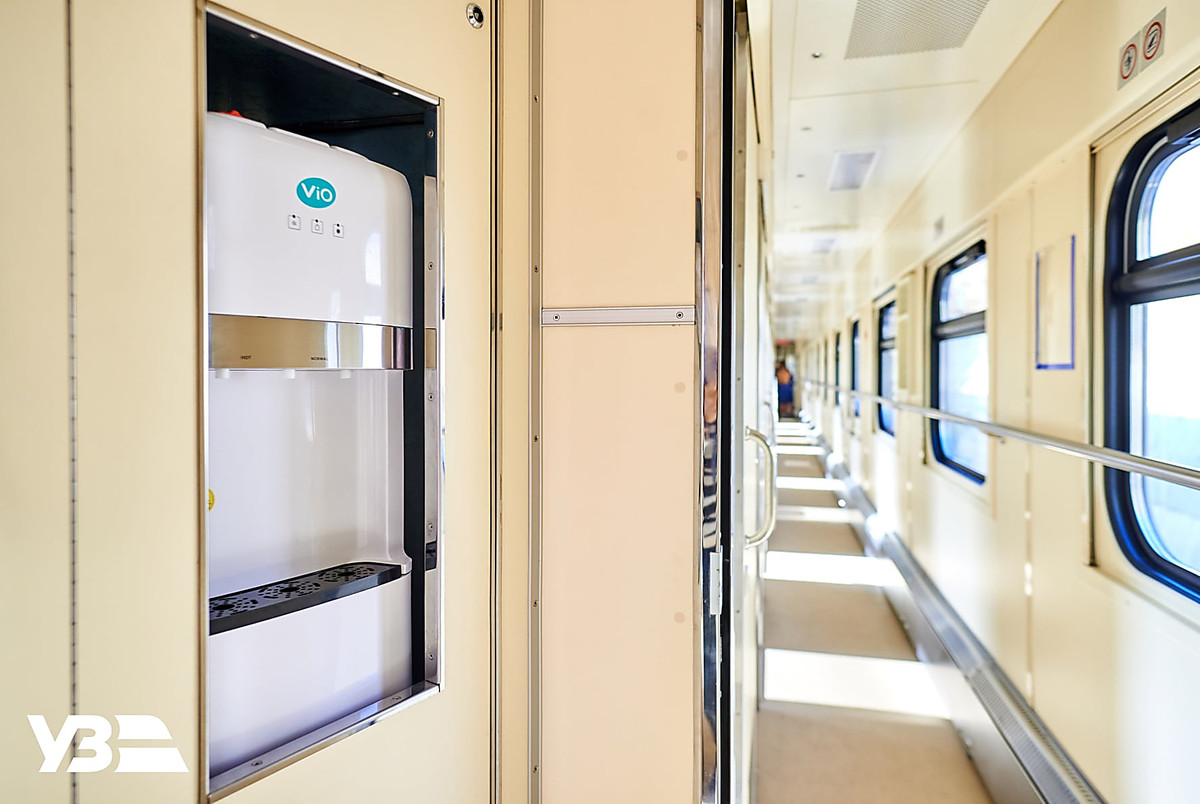 Также есть кулеры с горячей и холодной водой. Купе оборудованы системой сигнализации - на ночь двери фиксируются кнопкой блокировки, и при открытии двери соответствующий сигнал поступает в купе проводника.