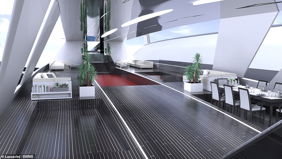 В Концепции также указано, что на каждой стороне яхты-дирижабля будут находится пять люксов для пассажиров с впечатляющим видом из окон, кроватями и душем. А в задней части каждого дирижабля разместится большая смотровая площадка.