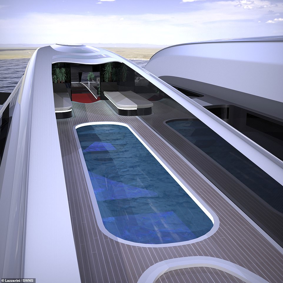 В центральном отсеке расположится бассейн, гостиная и обеденная зона. В нижней части каждого из дирижаблей будут сделаны надувные трюмы. Они будут заполняться воздухом при приближении к воде, что позволит транспортному средству при необходимости плавать. Скорость движения по воде составит порядка пяти узлов.