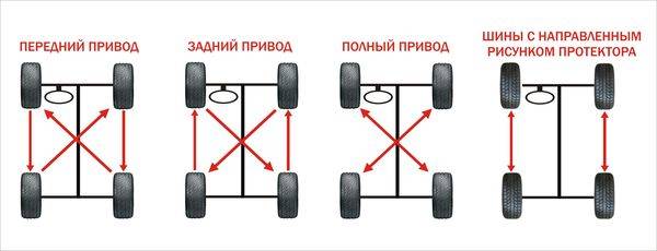 Если вы решите своими руками перебросить шины, используйте надежный автомобильный домкрат, дабы избежать травм. Схемы перестановки зависят от того, какие колеса являются ведущими, а также непосредственно от типа рисунка протектора автопокрышек.