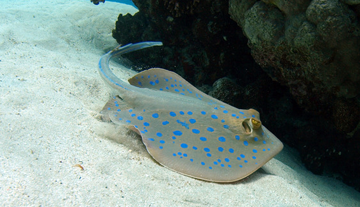 - Синеточечный скат (лат. Taeniura Lymna). Этот обитатель Индийского океана привлекает внимание эффектным окрасом (яркие голубые пятна на сером теле). В длину с хвостом скат достигает 70 см, а диаметр его тела − 50 см.