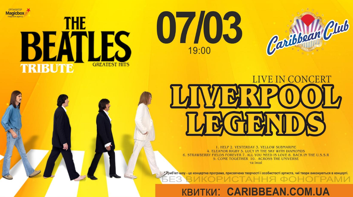Если вы хотите пропитаться духом The Beatles, ощущая как по коже бегут мурашки на песне «Hey Jude», испытать сжимающую грудь ностальгию на «Yesterday», если для вас и ваших друзей фраза «Come together» - это пароль, а «Let it be» - девиз по жизни, тогда добро пожаловать на борт желтой подводной лодки 7 марта в Caribbean Club!