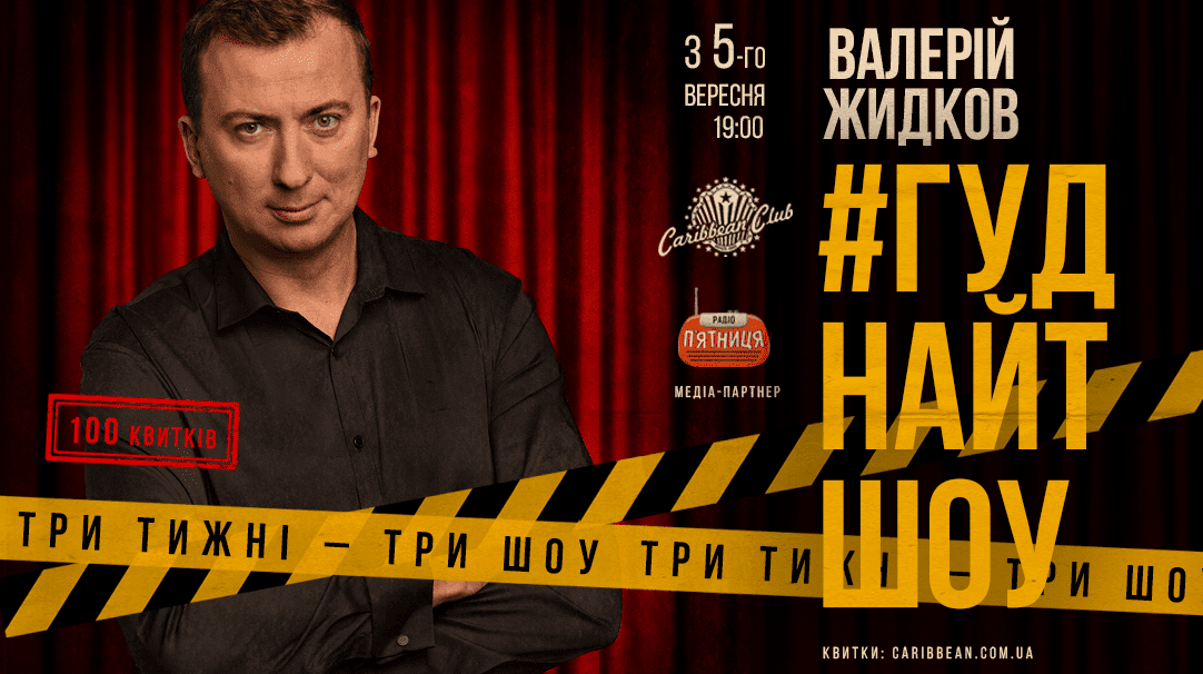 Автор студии «Квартал 95» Валерий Жидков в начале осени выступит в Киеве с серией сольных стендап-шоу. 5, 12 и 19 сентября комик представит свой авторский проект #ГудНайтШоу в столичном Caribbean Club Concert Hall.