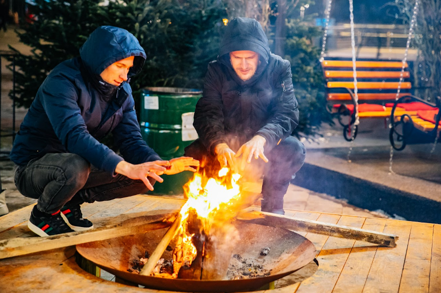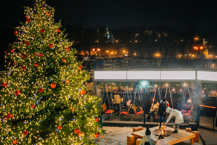 Самая теплая новогодняя локация Киева. Одна из главных киевских аттракций на зимние праздники — прогулка от Арсенальной площади, через Мариинский парк, Стеклянный мост, Владимирскую горку до самого Подола. Праздничная зона у Арки Дружбы станет вашим теплым убежищем и самой красивой точкой на пике этого маршрута. Она представляет собой стильную панорамную лаунж-галерею, укрытую от ветра, с которой открывается, пожалуй, лучший вид на Киев. Здесь повсюду полыхает живой огонь, заключенный в арт-инсталляции. А специальные конструкции ограждают внутреннее пространство от любых порывов ветра.