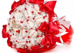 Красивые композиции составляют из самых разнообразных предметов. Они могут состоять из конфет, фруктов, чая и других угощений. Не менее оригинально смотрятся букеты из мыла ручной работы.