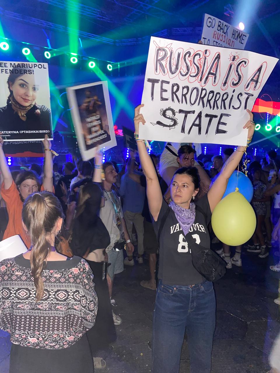 - Alina Pash не тільки влаштувала на сцені потужний перформанс із розриванням світлини Віктора Орбана й володимира путіна, співала пісні під відеоряд із кадрами розбомбленої росіянами України та закликала скандувати «Ганьба росії!». Разом з Олександрою Заріцькою з гурту KAZKA вона продовжувала інформаційну кампанію під час виступів інших артистів із плакатами та промовами.