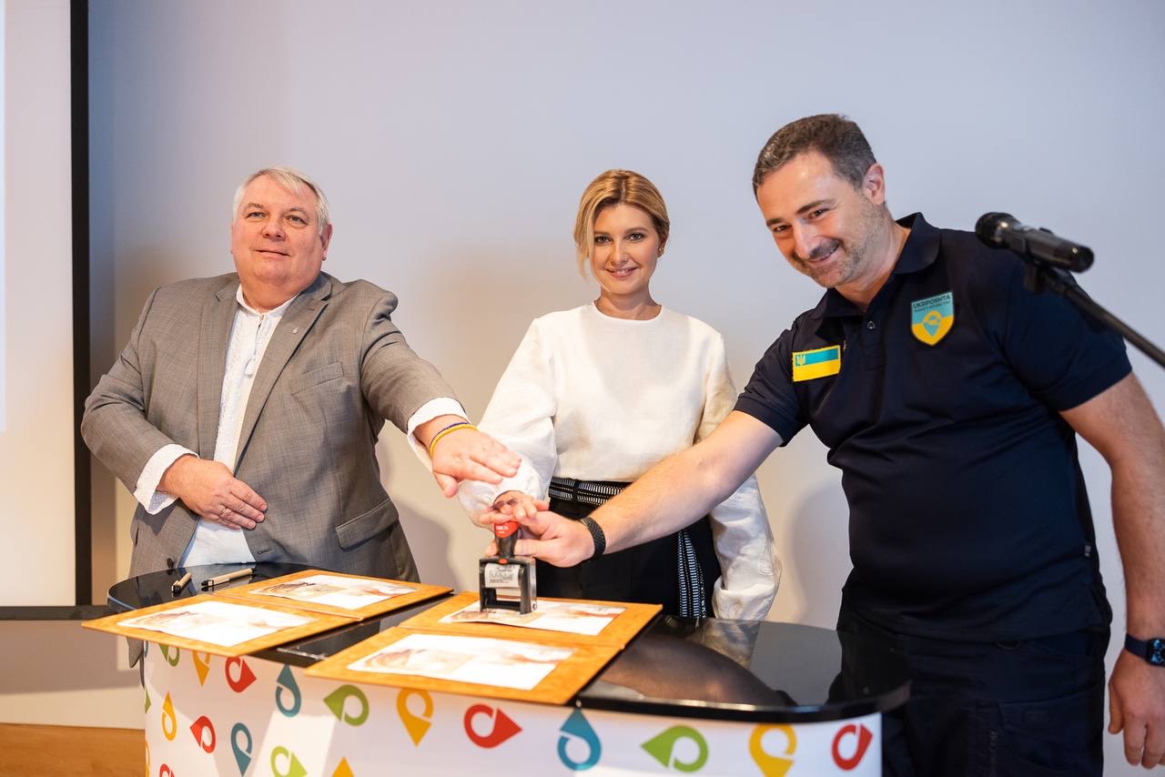 Пам'ятні відбитки штемпеля “перший день” на конверті та марці поставила Олена Зеленська, Генконсул України у Нью-Йорку Олексій Голубов, генеральний директор Укрпошти Ігор Смілянський.