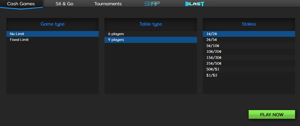Кешовики можуть приєднатися до різноманітних лімітів: від NL2 до NL5K. Максимально можна відкрити одночасно до шести столів. Найбільш популярною дисципліною являється Холдем (столи фулл-рінг, а також 6-макс). Зручний пошук дозволяє обрати тип гри, кількість гравців, та блайнди: