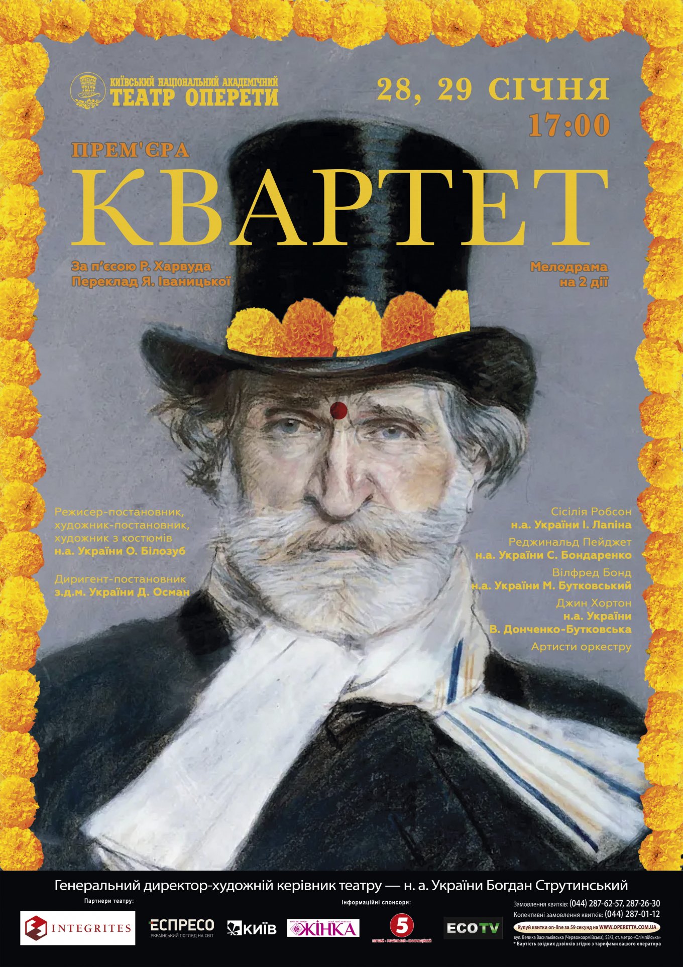 28 січня о 16:15 год. Національна оперета України (вул. Велика Васильківська, 53/3) запрошує представників ЗМІ на прес-підхід з нагоди прем’єрної вистави «Квартет»режисера Олександра Білозуба.