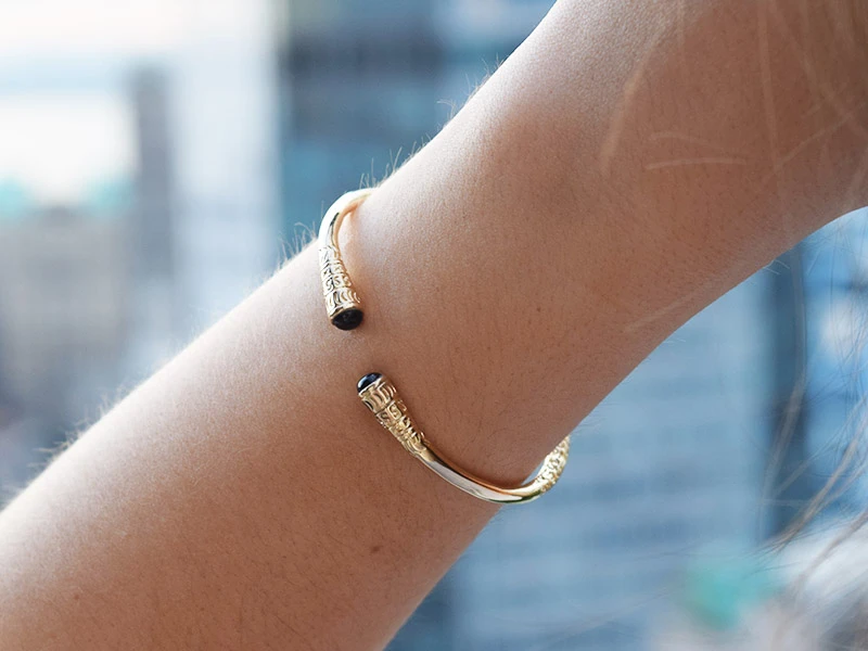 - використовуйте прийом «менше, але вагоміше»: замість того, щоб носити багато тонких, дзвінких браслетів, оберіть одну масивну, гладку манжету.