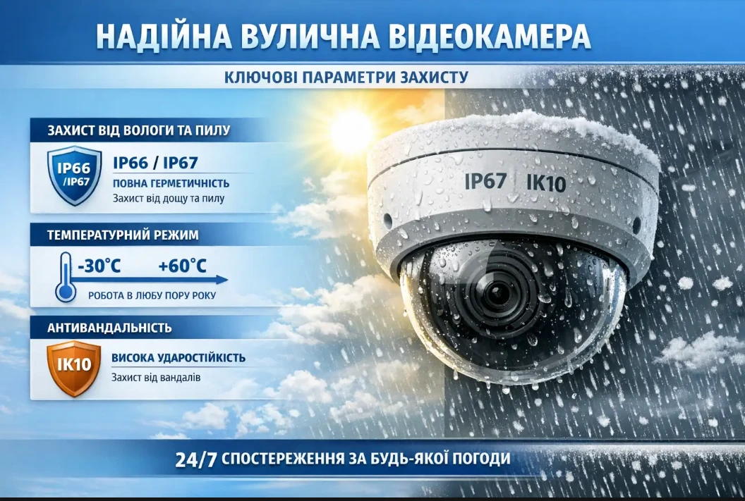 Перше, на що варто звернути увагу при виборі обладнання для вулиці — це клас захисту корпусу. Камера постійно перебуває під впливом навколишнього середовища, тому її "броня" має бути відповідною.