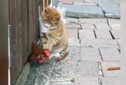 Кошка и курицаНа кадрах видно, что домашняя птица просто клюет зерна, рассыпанные у входа в курятник. Однако усатой даме, похоже, эти действия надоели, и она стала лапкой засовывать голову курицы обратно за ограждение, передает FaceNews.