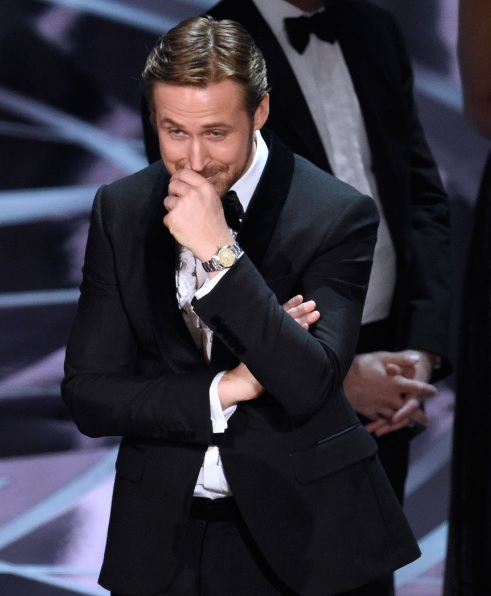 Райан Гослинг, номинированный в категории «Лучшая мужская роль» за участие в мюзикле, поняв, что «Ла-Ла Ленд» объявили лучшим фильмом по ошибке, начал смеяться в кулак: