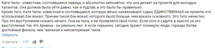 Этот комментарий собрал 177 лайков и согласные комментарии, что Катя Чили просто "пиарится перед концертом в Киеве".