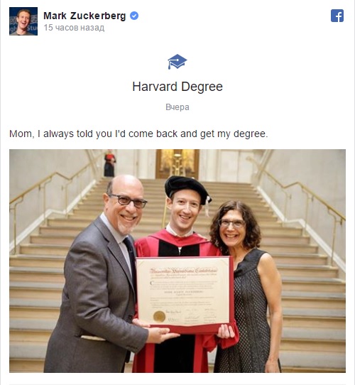 Американский программист и предприниматель в области интернет-технологий, долларовый миллиардер Марк Цукерберг завершил учебу в Гарварде после того, как 12 лет назад бросил университет, чтобы посвятить все свое время развитию социальной сети Facebook.