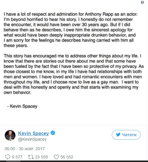 Спейси сделал это признание после того, как актер Энтони Рэпп обвинил его в сексуальных домогательствах в 1986 году, когда последнему было 14 лет. По словам Рэпп, это произошло после вечеринки дома в Спейси, когда все гости разошлись. Сам Спейси заявил, что не помнит такого случая, но извинился перед Рэпп.