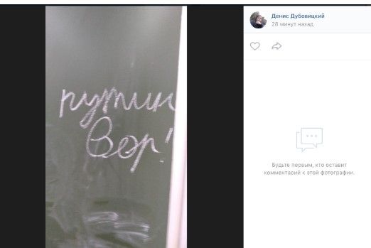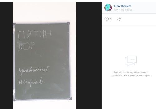 "Республика Бурятия, город Гусиноозерск, школа №4. У школьников начался челлендж", – отмечается в подписи к фотографии, на которой изображена школьная доска с надписью "Путин вор".