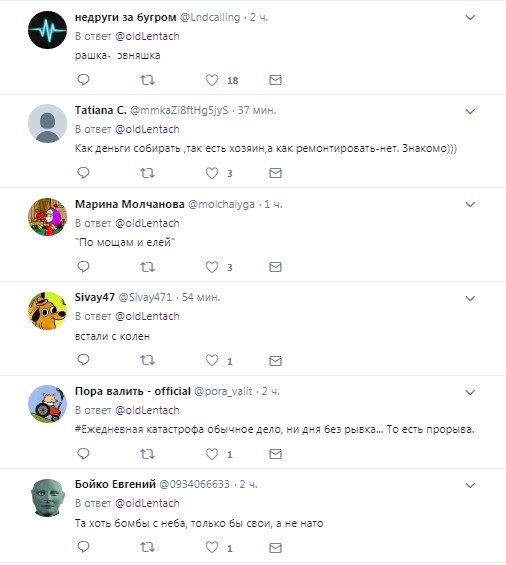 "Рашка-*овняшка", "По мощам и елей", "Как деньги собирать, так есть хозяин, а как ремонтировать-нет. Знакомо", "Встали с колен", "Та хоть бомбы с неба, только бы свои, а не НАТО", "Бомбить Воронеж уже не нужно, он и без того сам превращается в прах и *овно", - пишут в сети.