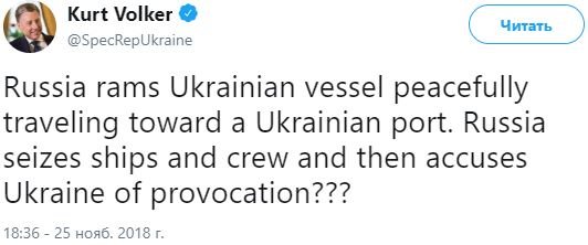 "Россия таранит украинское судно, мирно следующее в направлении украинского порта. Россия захватывает корабли и экипаж, а затем обвиняет Украину в провокации???" – написал он в Twitter.