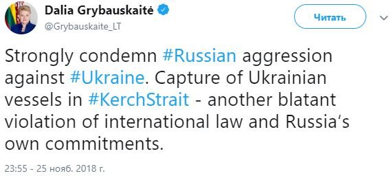 "Решительно осуждаю агрессию России против Украины. Захват украинских судов в Керченском проливе – еще одно вопиющее нарушение Россией международного права и ее собственных обязательств", – написала она.