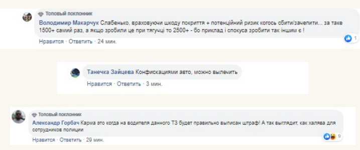 На странице «Киев Оперативный» в Facebook подписчики соглашаются, что кармический ответ наступил быстро, но проявился слабо: было бы желательно, чтобы дерзкого водителя еще и лишили прав или отобрали автомобиль.