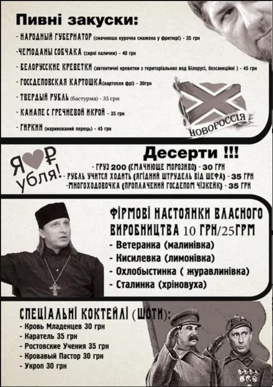 - серед коктейлів та настоянок: "Кров немовляти", "Каратєль", "Ростовські навчання", "Кривавий пастир", "Укроп", "Охлобистинка", "Ветеранка", "Сталінка".