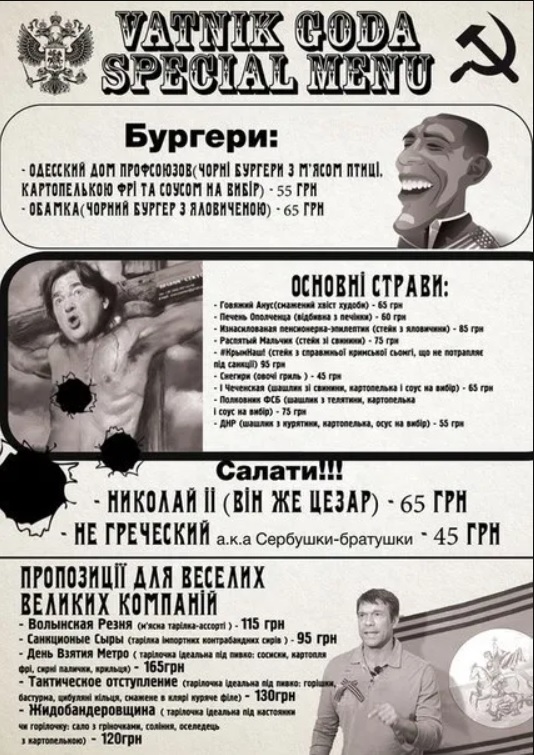 - серед основних страв - "Зґвалтована пенсіонерка-епілептик", "Розіп’ятий хлопчик", "Печінка ополченця", "Снігурі";